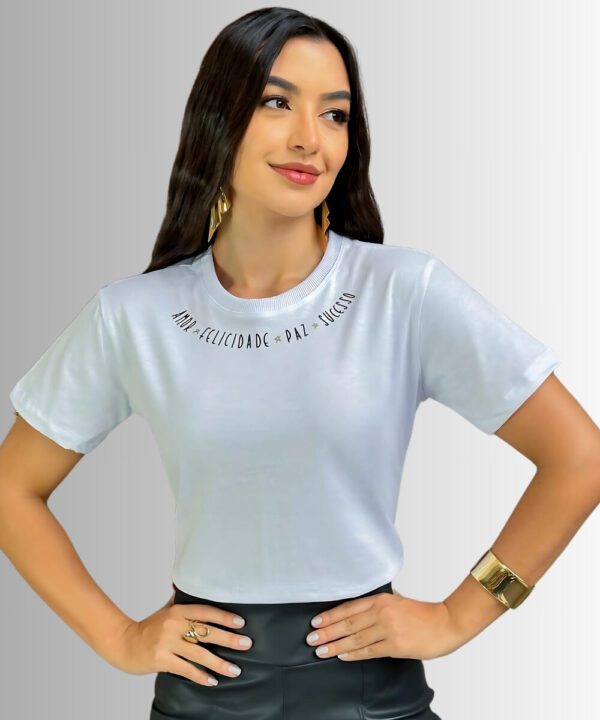 Especificações da Camiseta Amor, Felicidade, Paz e Sucesso – Cor Branca.