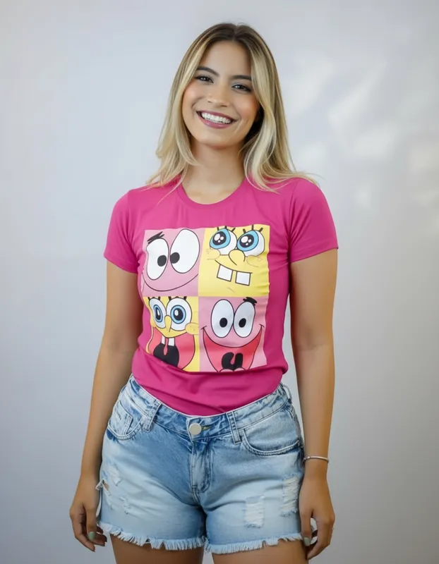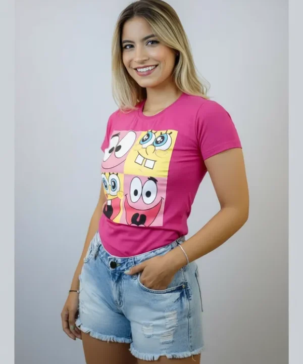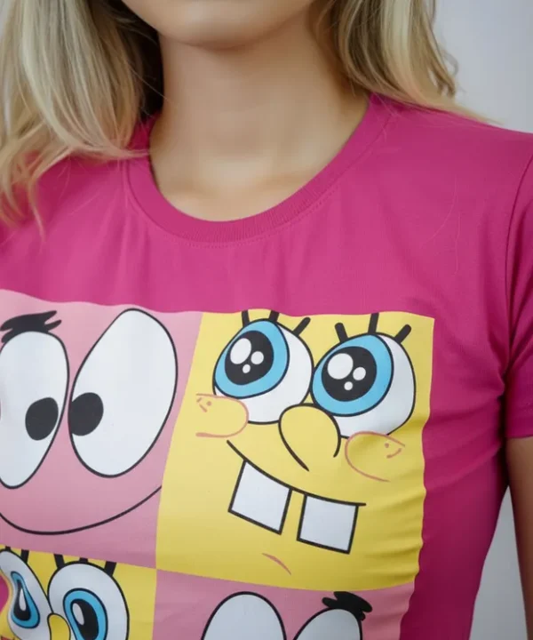 Veja abaixo as especificações de nossa T-Shirts Bob Esponja e Patrick na cor rosa.