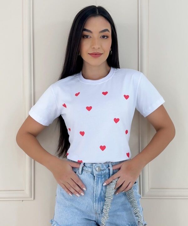 Veja abaixo as especificações de nossa T-Shirts Corações na cor Branca