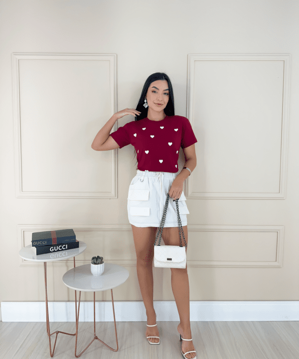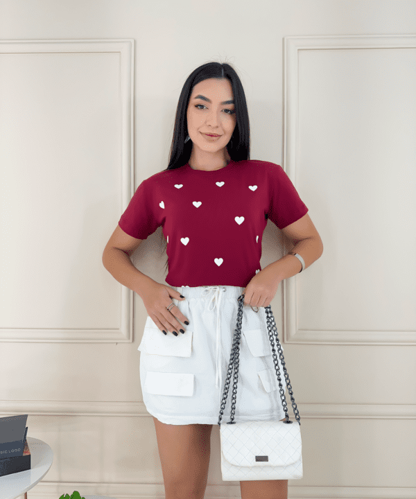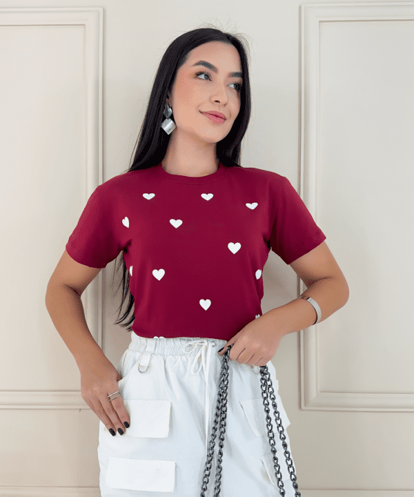 Veja abaixo as especificações de nossa T-Shirts Corações na cor Marsala