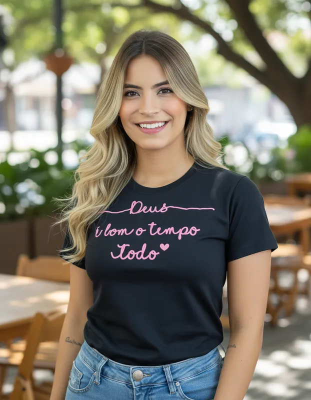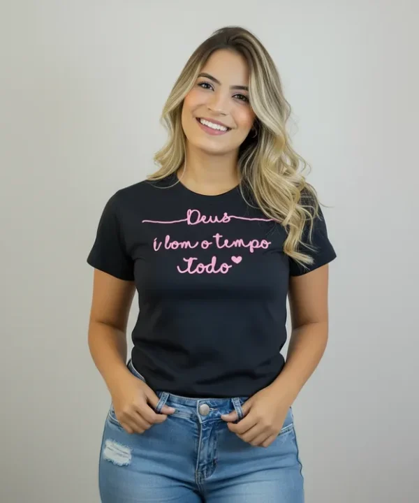 Veja abaixo as especificações de nossa T-Shirt Frase Deus é bom na cor preta.
