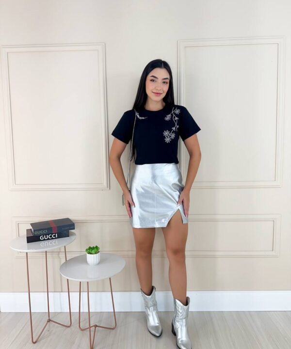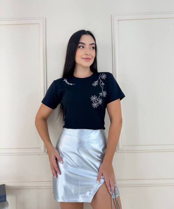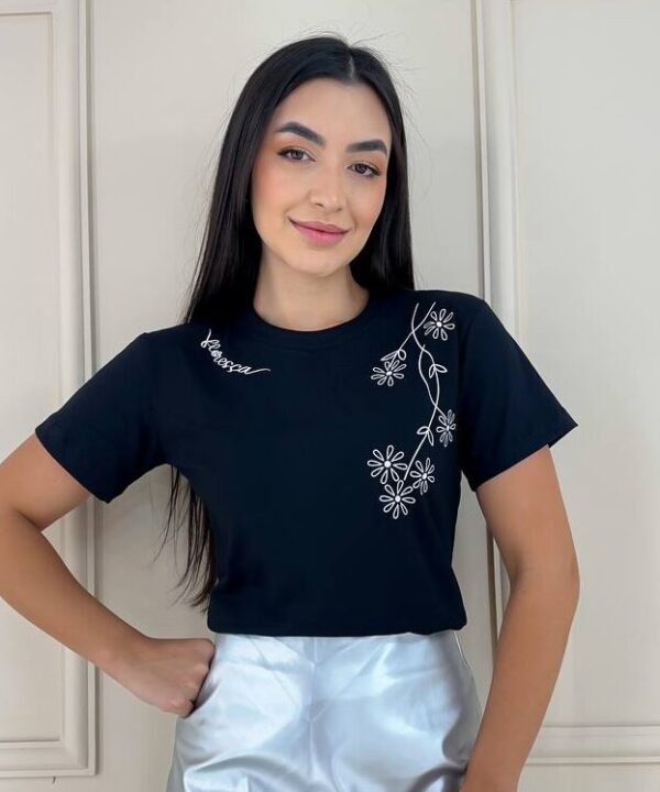 Veja abaixo as especificações de nossa T-Shirts Floresça na cor Preta.