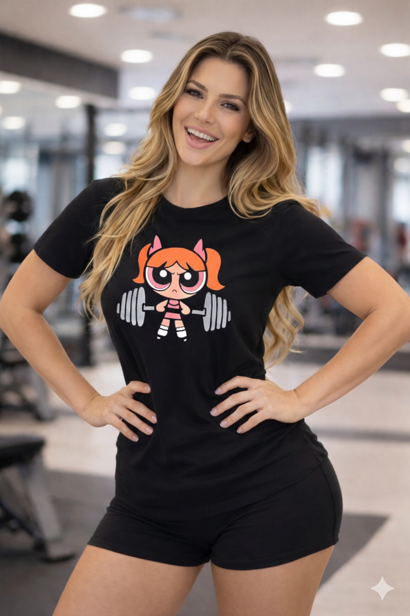 Veja abaixo as especificações de nossas T-Shirt Meninas super poderosas personagem Florzinha Academia Preto..