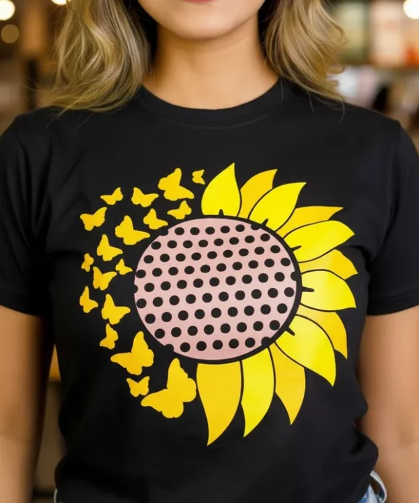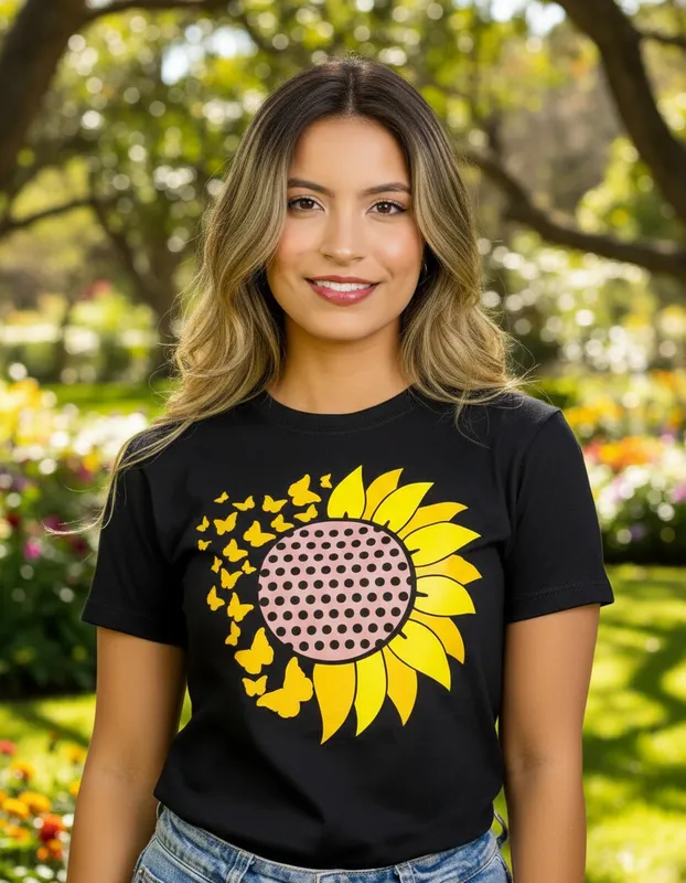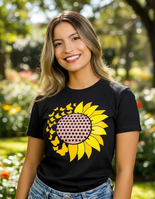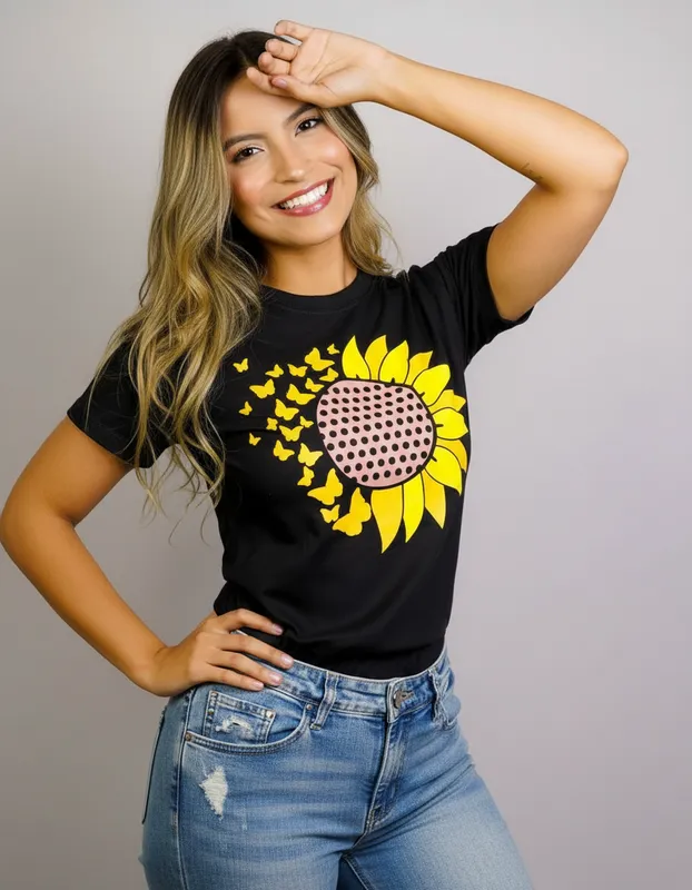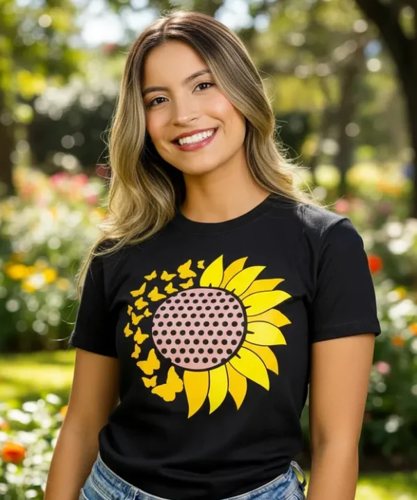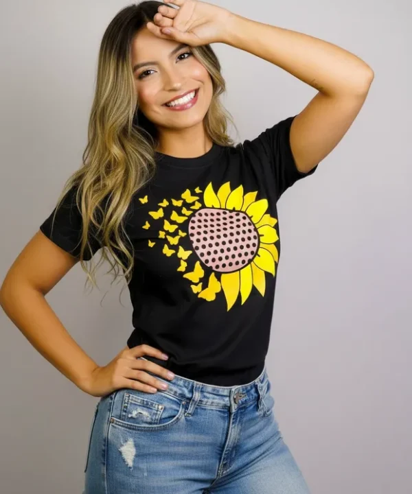 Veja abaixo as especificações de nossas T-Shirt Girassol preta.