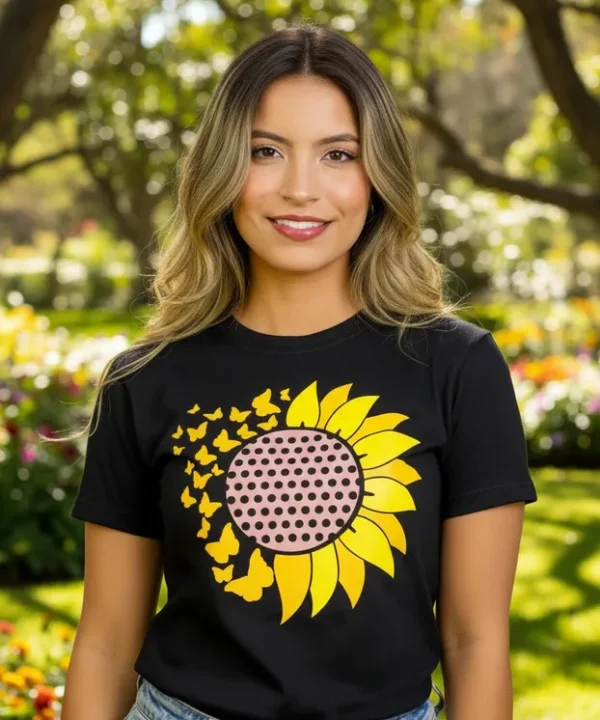 Veja abaixo as especificações de nossas T-Shirt Girassol preta.
