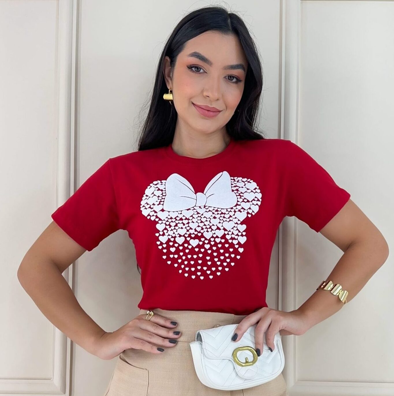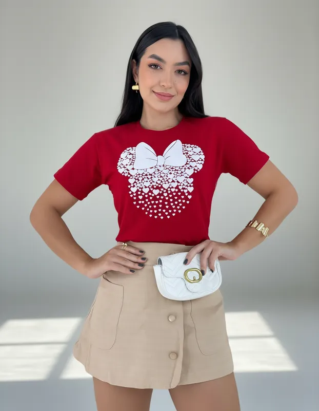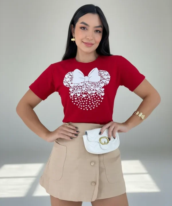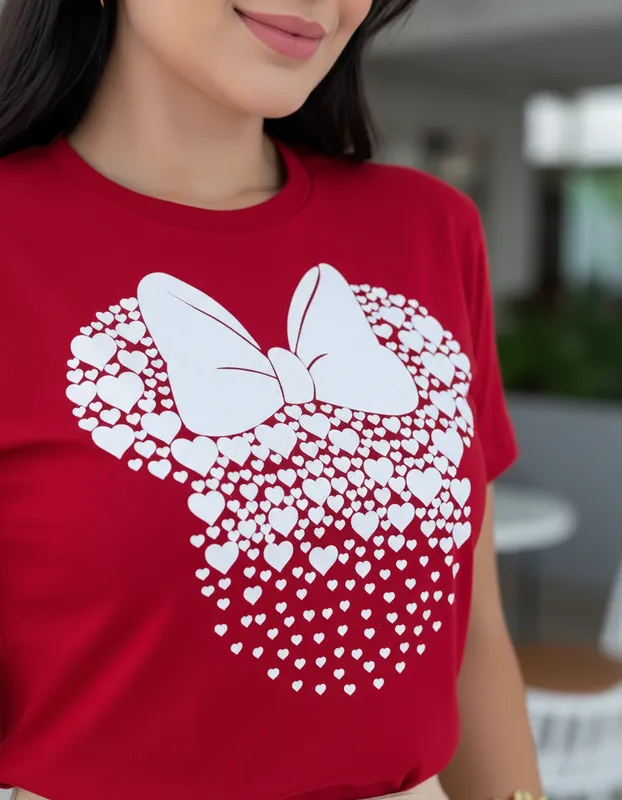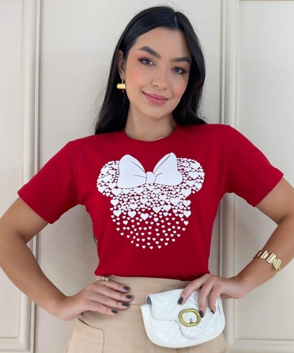 Veja abaixo as especificações de nossa T-Shirts Minnie Corações na cor Vermelha e estampa em alto relevo.