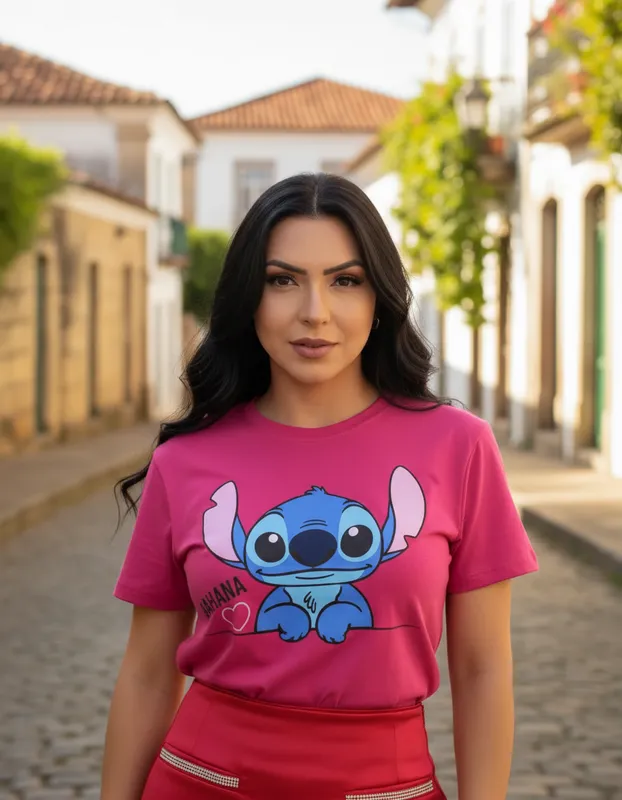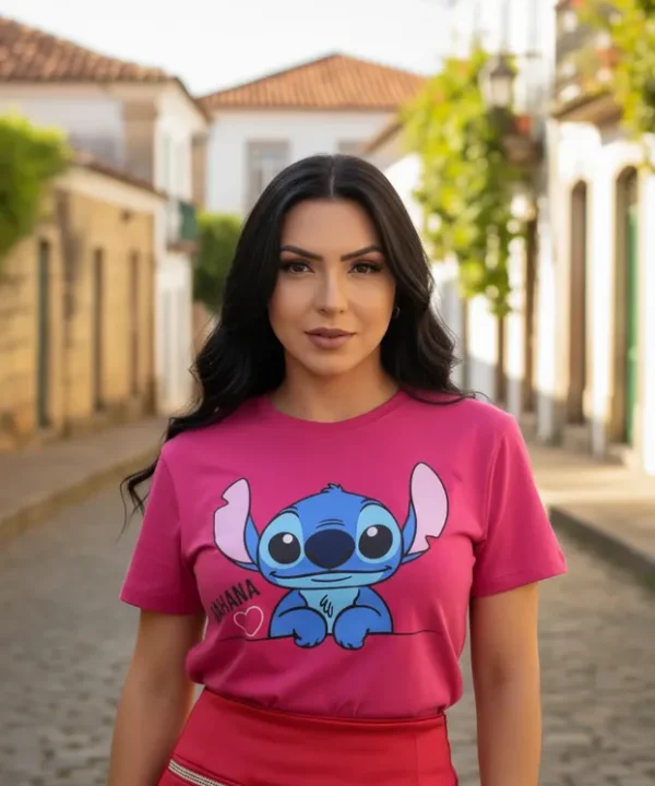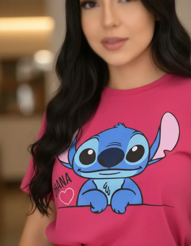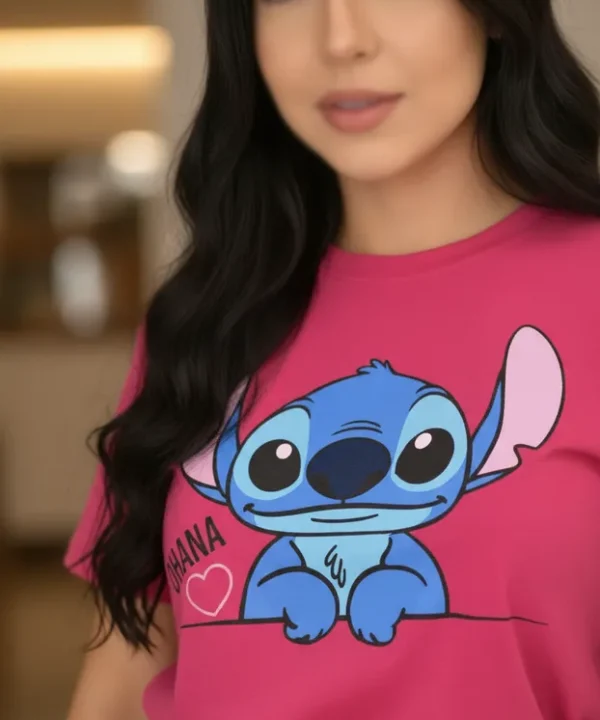 Veja abaixo as especificações de nossa T-Shirt Ohana Lilo Stitch na cor rosa.