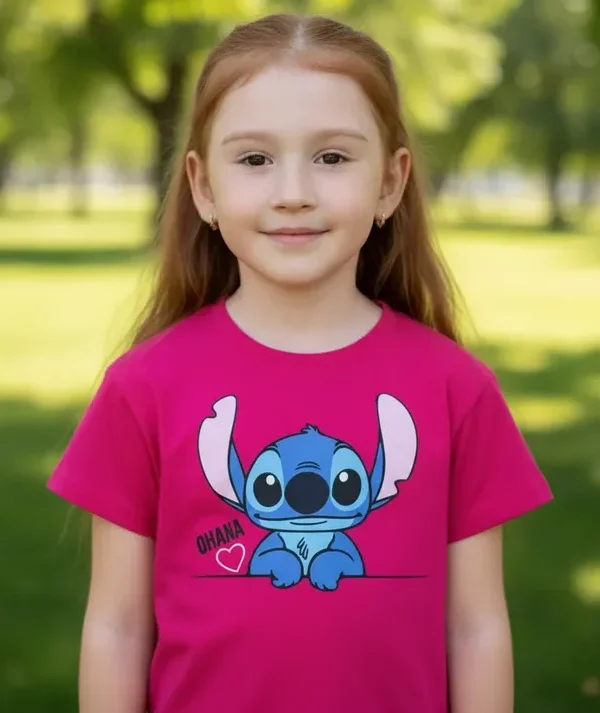 Veja abaixo as especificações de nossa T-Shirt Infantil personagem Lilo Stitch Ohana Rosa infantil menina.