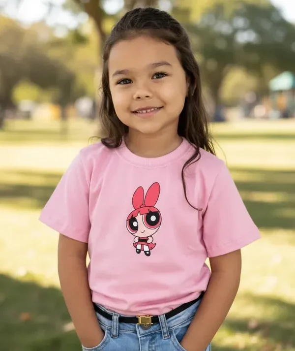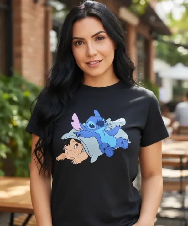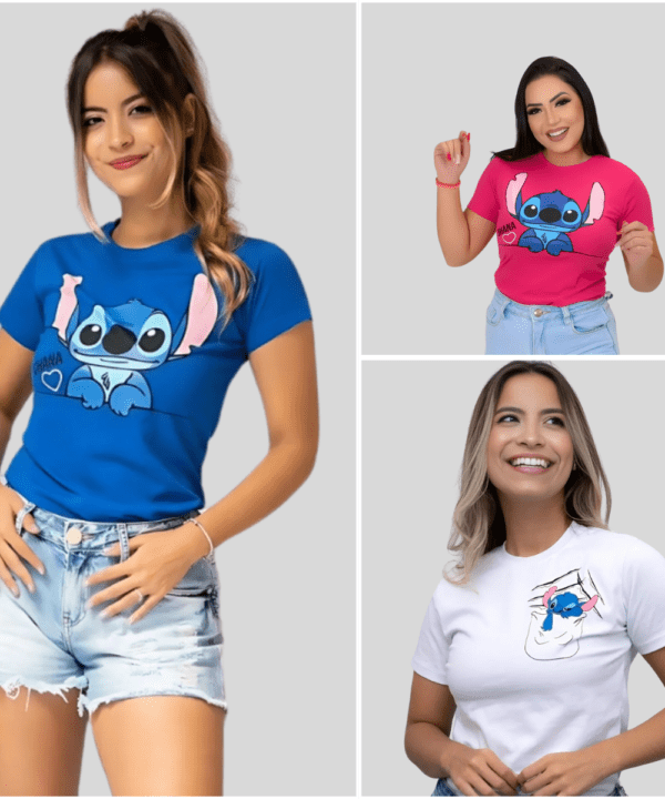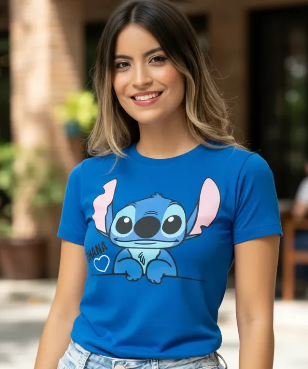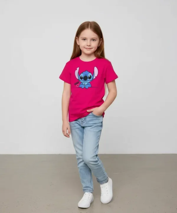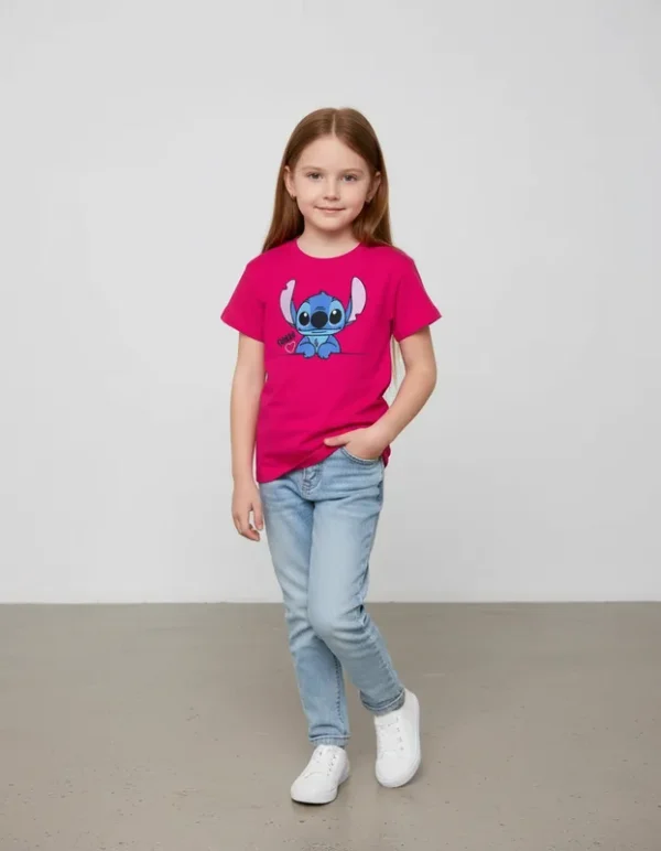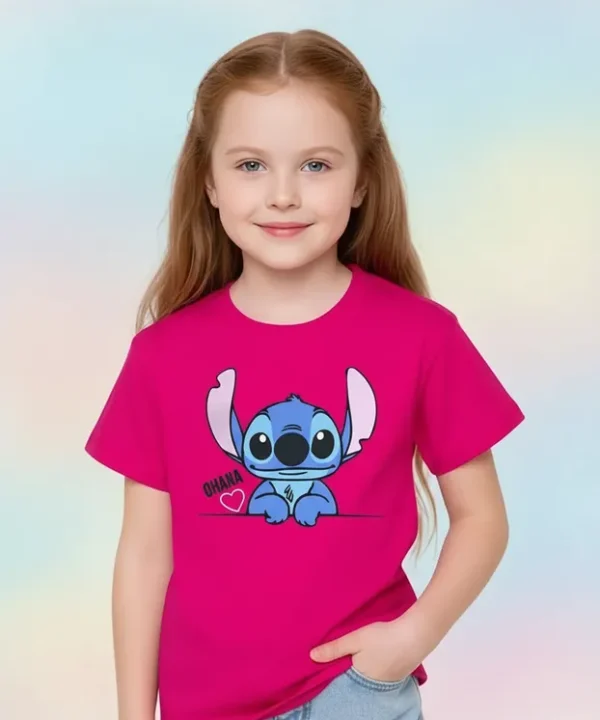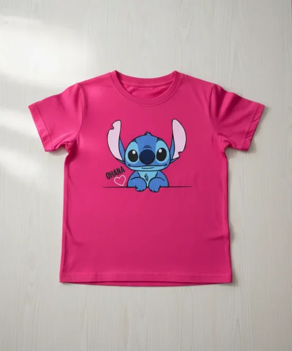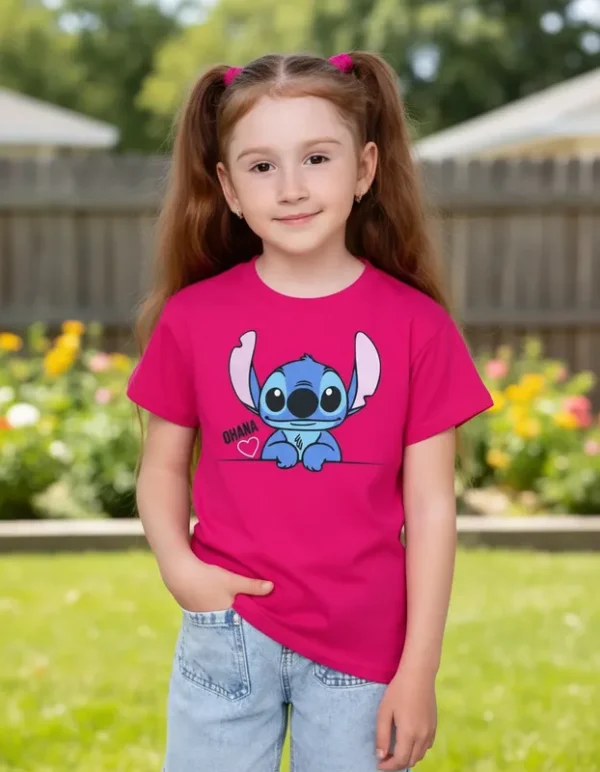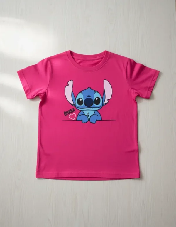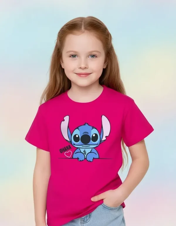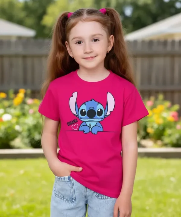 Veja abaixo as especificações de nossa T-Shirt Infantil personagem Lilo Stitch Ohana Rosa infantil menina.