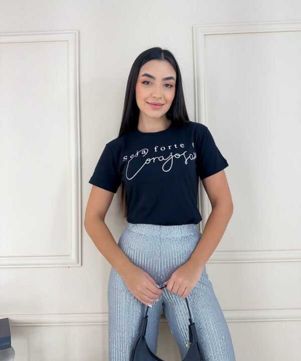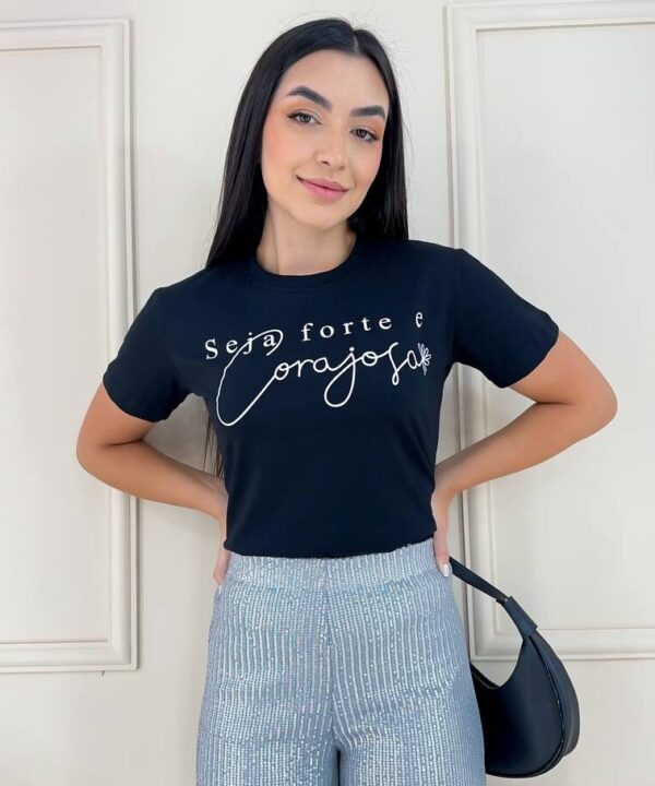 Veja abaixo as especificações de nossa T-Shirts Seja Forte e Corajosa na cor preta.
